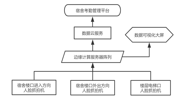 基于本校宿舍基本情況,結(jié)合學(xué)校運(yùn)營管理模式,將宿舍考勤系統(tǒng)軟硬件模塊按照如下架構(gòu)圖部署。綜合樓大門處出入兩方向根據(jù)樓道寬度分別安裝2-4個人臉識別抓拍機(jī),6-11樓層電梯口各安裝2-3個人臉識別抓拍機(jī),抓拍機(jī)視頻圖像數(shù)據(jù)通過網(wǎng)絡(luò)路由設(shè)備實時匯總*宿管邊緣計算服務(wù)器陣列,服務(wù)器將視頻流信息中解析出的人臉數(shù)據(jù)與校方學(xué)生人臉庫信息進(jìn)行實時N比N快速驗證,獲得學(xué)生身份信息,將對比結(jié)果實時顯示在數(shù)據(jù)可視化大屏上。結(jié)合學(xué)校考勤及宿舍管理邏輯,將各維度報表分析推送*云服務(wù)器,校方管理人員可通過宿舍考勤管理平臺獲取數(shù)據(jù)分析結(jié)果。